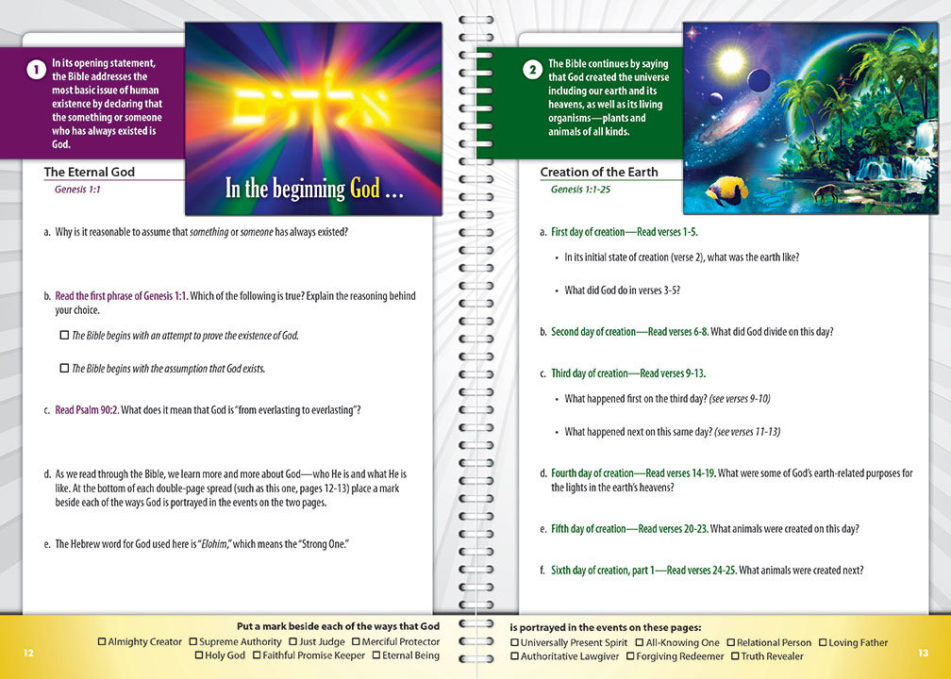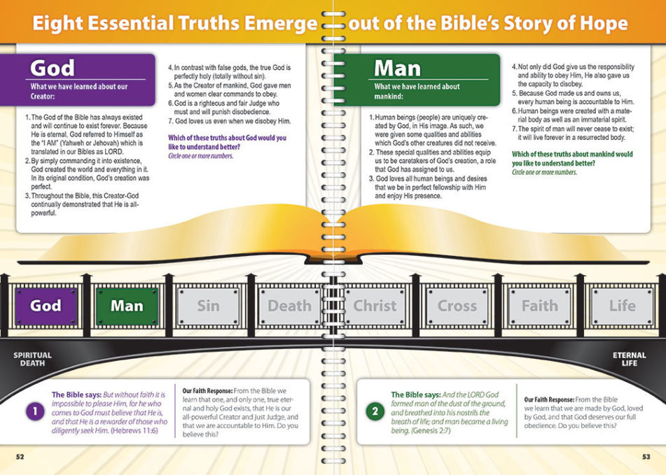Forty strategically selected Bible events, twenty from the Old Testament and twenty from the New Testament, comprise The Story of Hope. Each event is beautifully visualized. A set of evangelism-focused Bible study questions is included in the material for each event. The workbook also includes colorful maps of the Bible lands, highlighting where the events occurred, as well as a very informative visual of the Old Testament’s tabernacle in the wilderness. The Chronological Bridge(ChronoBridge) to Life, which follows the study of the redemptive story, summarizes eight essential “eternal life or death truths” that emerge from the Bible’s story of hope. Sixty-four pages and plastic coil binding. Full color.