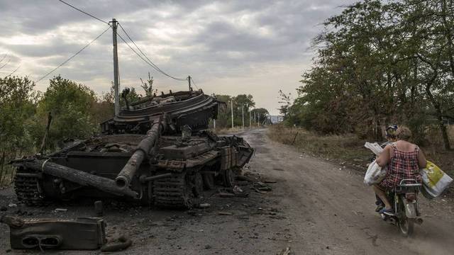 Women ride past a burned out Ukrainian tank in the town of Ilovaysk Photo: MAURICIO LIMA | Agência O Globo