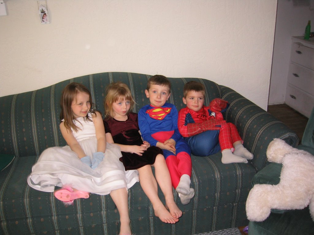 Have you ever wondered why little boys (and sometimes big boys) are so attracted to super heroes? Today we ate lunch with the Clancy’s. They have a 4 year old daughter and a little boy who just turned 3. They also have a bunch of dress up clothes. When Mishael saw the superman outfit he wasted no time in shedding his clothes and donning the super heroes’ garments.
