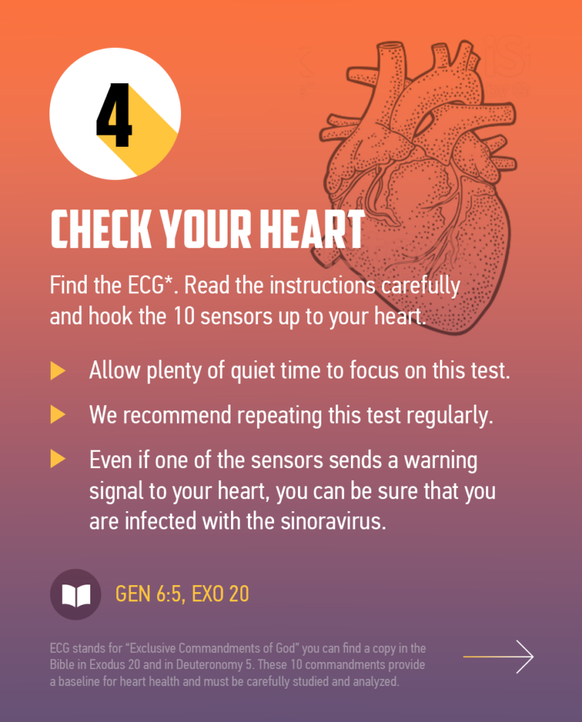 Once again, this is a tricky one to check and you’ll need help. In order to make a good exam, you’ll need an ECG. Read the instructions carefully, and then take some time to hook the ten sensors up to your heart. Warning: this is not a quick process, so allow plenty of quiet time to focus on this test. Also, we recommend repeating this test regularly, as often certain warnings don’t appear the first time you run the test. That being said, even if one of the sensors sends a warning signal to your heart, you can be sure that you are infected with the Sinoravirus.