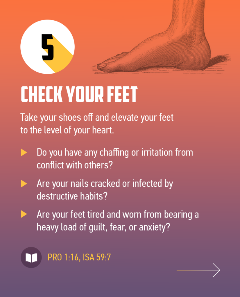 Finally, you need to check your feet. Take your shoes off and elevate your feet to the level of your heart. Do you notice any swelling of pride? Do you have any chaffing or irritation from conflict with others? Are your nails cracked or infected by destructive habits? Are your feet tired and worn from bearing a heavy load of guilt, fear, or anxiety?
