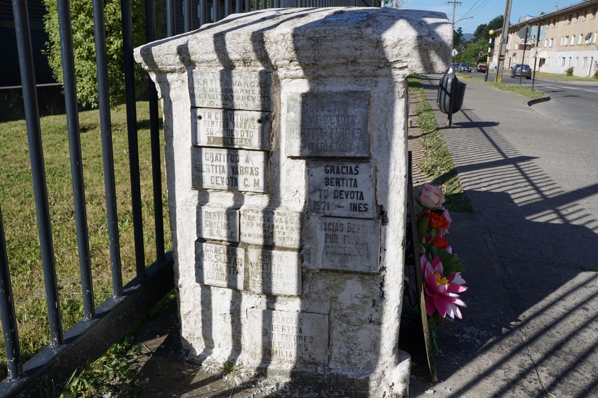 This above altar is to someone named Bertita. The plaques affixed to the side of the altar are from people who prayed to Bertita and their prayers were answered. Most say something like”