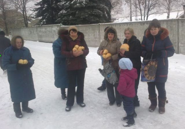 Women in Eastern Ukraine receiving bread from a church in Eastern Ukraine